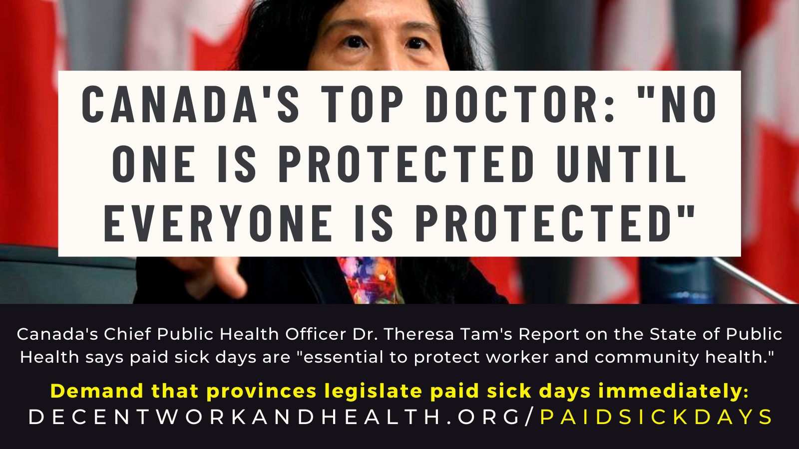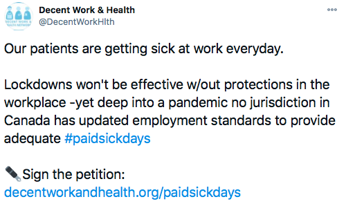 In October, Chief Public Health Officer Dr. Tam released a report calling for an equity approach to Canada’s COVID-19 response. The report explains how the long-term care crisis was fueled by precarious work and calls for paid sick days as “essential to protect worker and community health.”