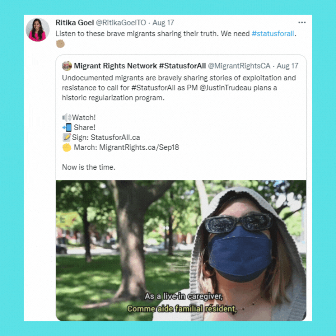 Here's where your support can make a difference, Sarah. Prime Minister Trudeau is working on a regularization program for undocumented migrants right now. The question is how many of the 500,000 undocumented people in the country will be given equal rights. Now is the time to act. One thing you can do right away is watch and share the video on your social media.